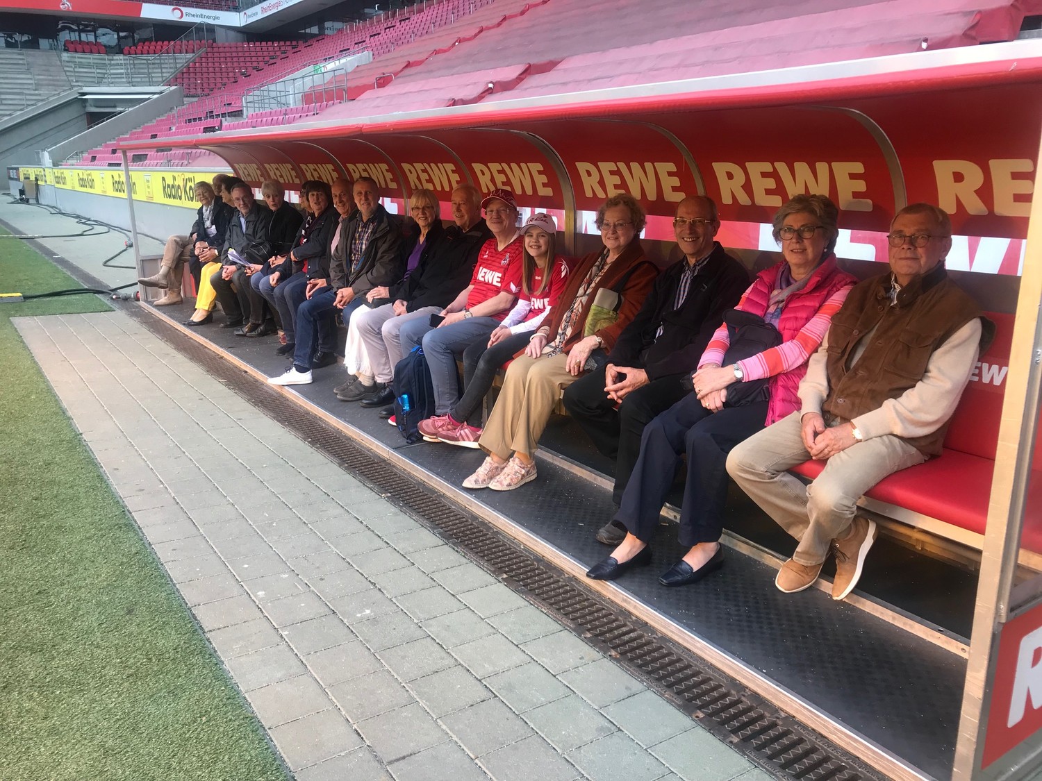Zum Ende unserer Stadion-Führung gingen wir die Treppe zum Spielfeld hinauf, die die Fußballer zum Spieleinlauf nehmen. Natürlich durfte dabei die FC-Hymne „Mir ston zo dir FC Kölle“ nicht fehlen. Wir haben kräftig mitgesungen. Das war schon ein sehr beeindruckender Schluss unserer Führung.